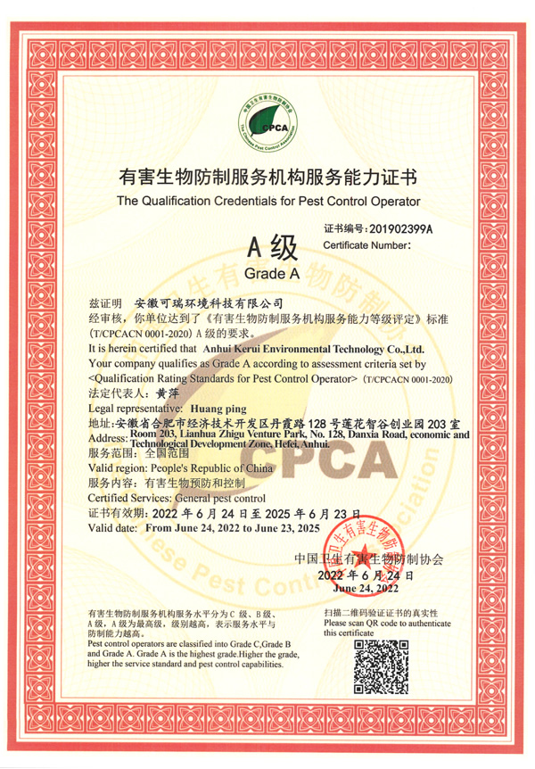 凱瑞蟲控是安徽可瑞環境科技有限公司旗下品牌,安徽可瑞環境科技有限公司成立于2014年,注冊資金500萬元,全國A級資質,致力于蟲害風險管理并提供蟲害消殺、防疫消毒、有害生物防制、蟲害控制管理與監測、衛生防疫消毒、商業清洗清潔服務、空氣治理服務、環境綠化施工與養護、藥品和器械銷售、技術咨詢與培訓等業務的服務性公司。公司是一家有行業資質、注冊商標及專利的公司。我們不參與各種擾亂市場秩序的低價競爭,堅持以合理的價格、新穎的設備、優質的技術、完善的質保體系和質保措施,來對客戶進行綜合的服務工作。公司本著...